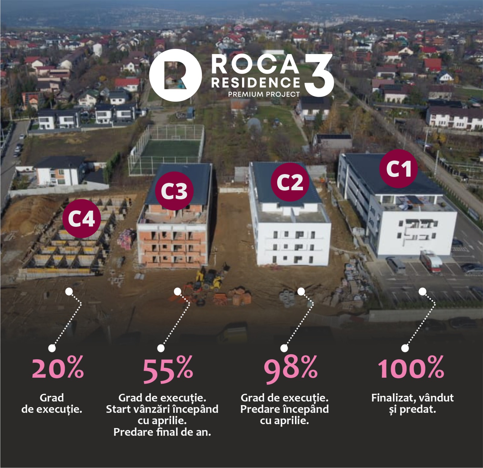 🔹 Bloc C3 – ~55% execuție, vânzări în curs, termen estimat de finalizare: final de an